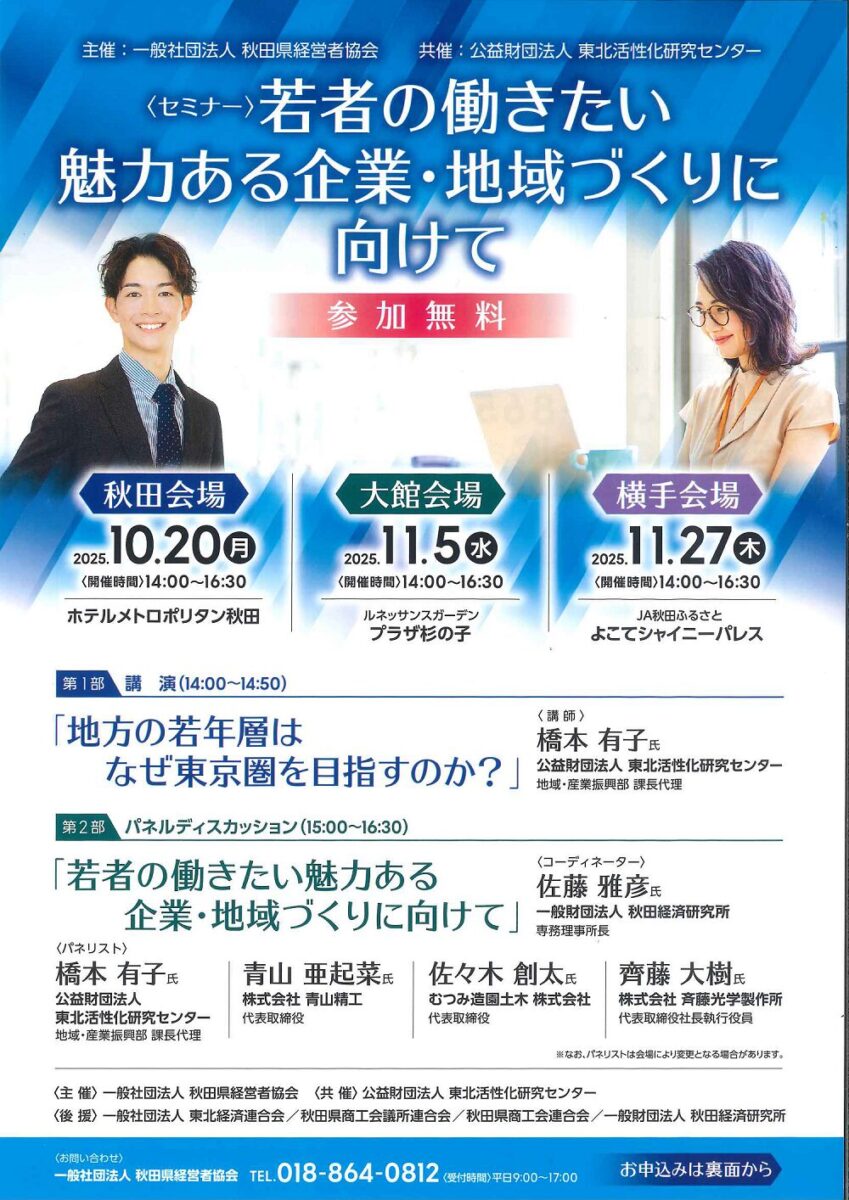 2025年10月15日 若者の働きたい魅力ある企業・地域づくりに向けて セミナー 2025年10月7日 改正労働法 実務対応セミナー セミナー 2025年10月7日 生成AI×事業計画 作成セミナー セミナー 2025年10月7日 カーボンニュートラル加速化に向けた講演会 イベント 2025年9月30日 鐵山TETSUZAN~釜石鉱山と東北地方の鉄スカルン鉱床~ イベント 2025年9月10日 事業承継セミナー セミナー