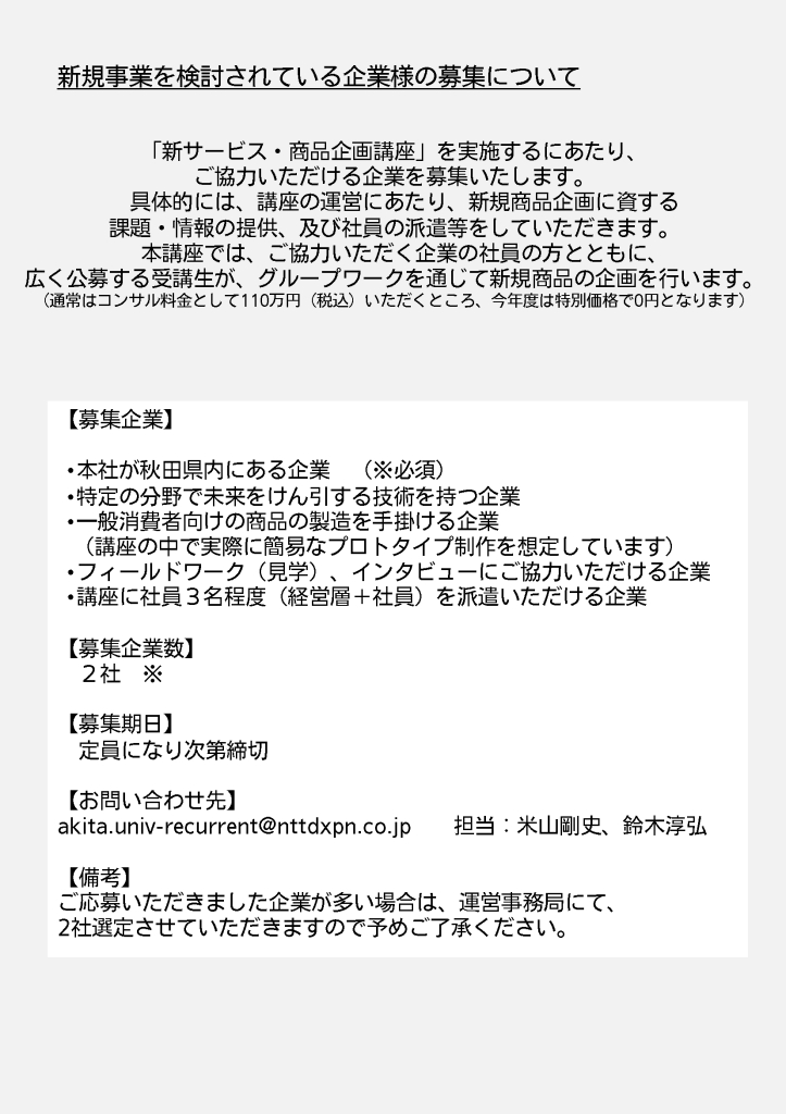 【講座に関して】akita.univ-recurrent@nttdxpn.co.jp/【その他に関して】dxdx@jimu.akita-u.ac.jp